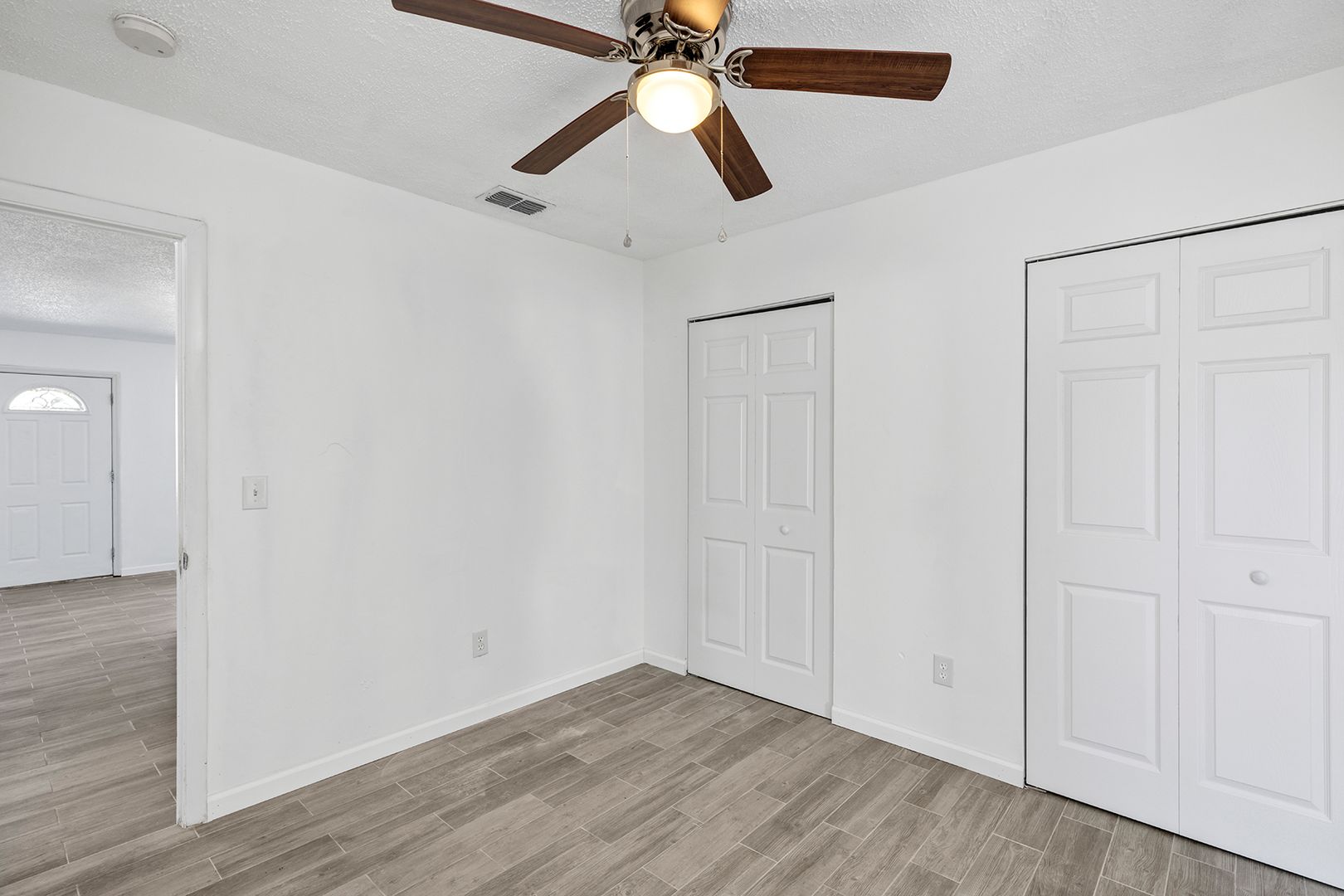 The bathroom includes a tub and shower combination along with a large vanity that provides generous counter space and storage. Both bedrooms feature spacious closets, enhancing everyday comfort and organization.