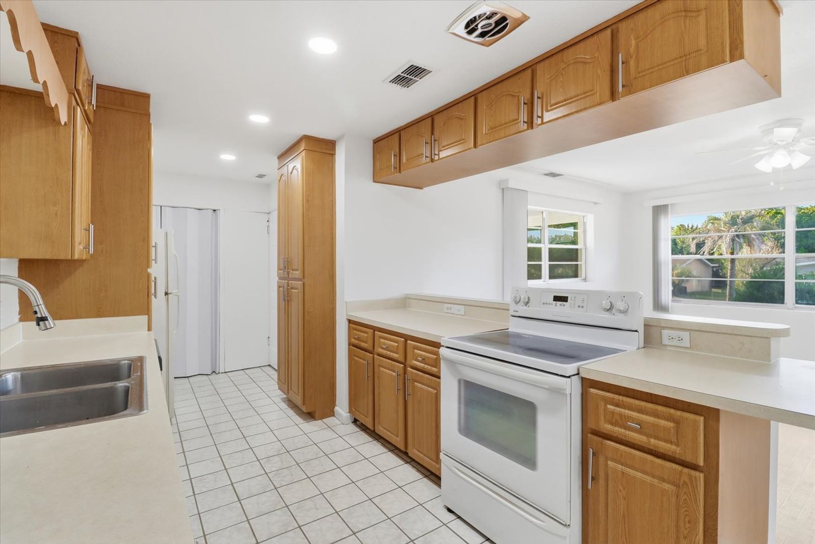 The open layout flows seamlessly with new laminate wood-look flooring in the living and dining areas and easy-care ceramic tile in the kitchen. The spacious eat-in kitchen is packed with warm oak cabinetry, a huge walk-in pantry, white electric range, refrigerator, refrigerator, built-in dishwasher, stainless steel gooseneck faucet, and a breakfast bar that opens right into the living room—perfect for everyday living and entertaining.A bonus enclosed Florida room adds flexible space for a home office, playroom, or sunny den.