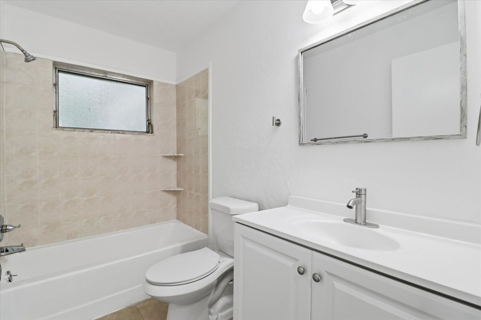 The fully updated bathroom features a crisp white vanity, modern brushed-nickel fixtures, tub/shower combo with classic tile surround, and a large contemporary mirror that makes the space feel even brighter.