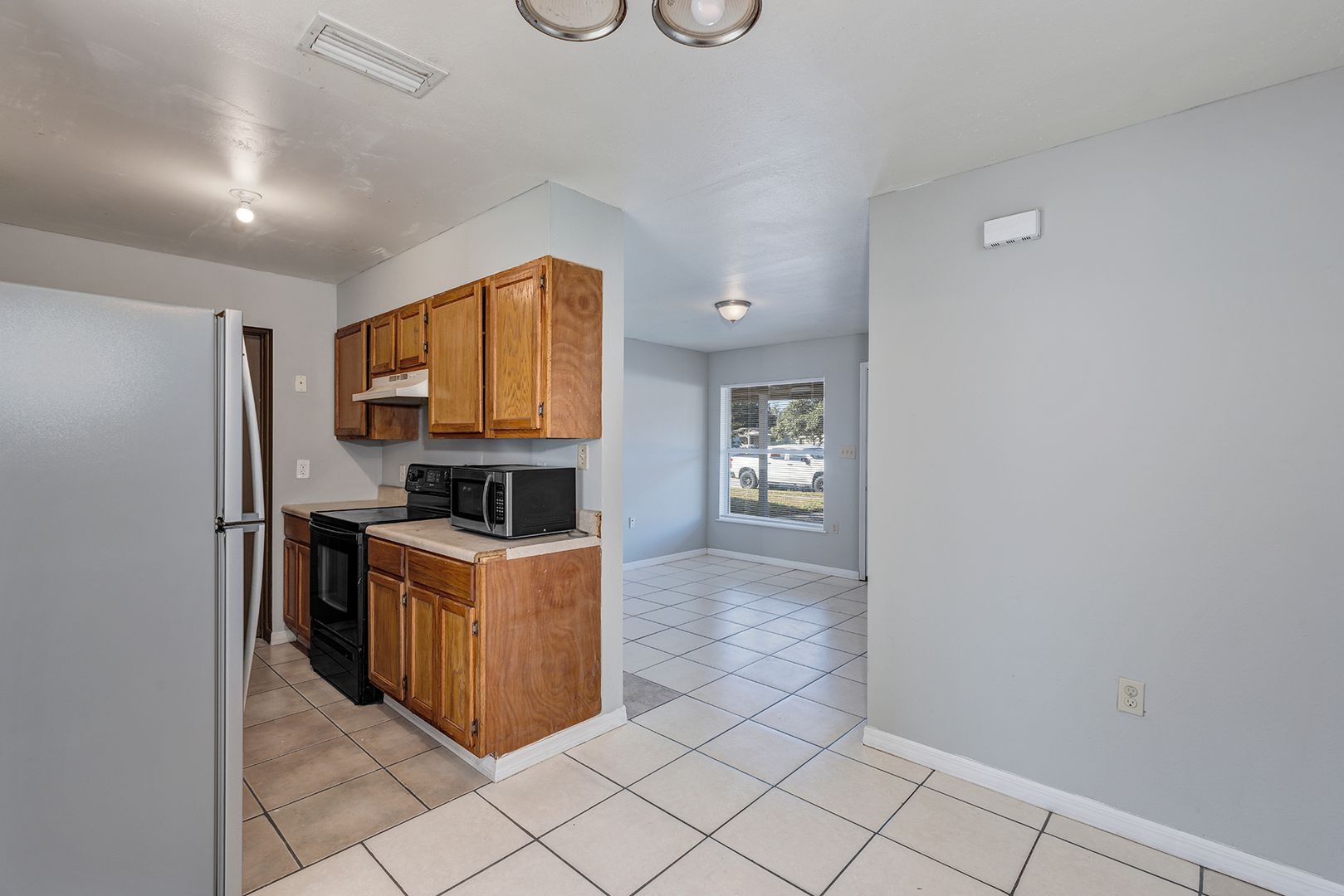 The kitchen is both stylish and practical, featuring brown wood cabinets, quartz countertops, and durable tiled flooring. There is ample cabinet and counter space, making meal preparation and storage easy and convenient. The tiled floors continue through key areas of the home, providing a sleek look that is also easy to maintain.