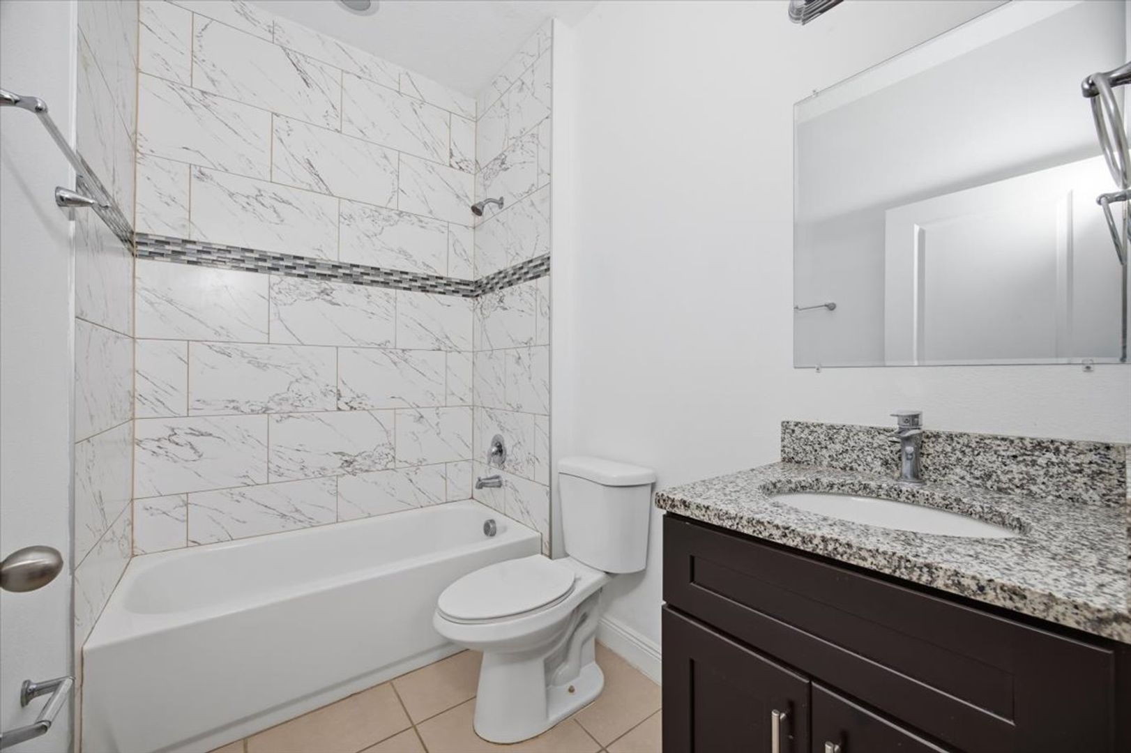 Both bathrooms are thoughtfully upgraded with tiled surfaces, double-basin vanities, and contemporary fixtures. Each bedroom includes built-in closets, ceiling fans, and fresh paint throughout enhances the bright, welcoming atmosphere. Additional amenities include an interior laundry area and a garage for convenient parking or storage.